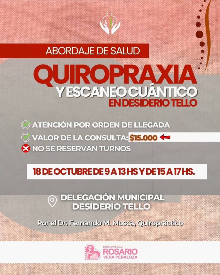 En Desiderio Tello, el Dr. Fernando M. Mosca realizará quiropraxia y escaneo cuántico, de 9 a 13 hs y de 15 a 17 hs, también por orden de llegada.