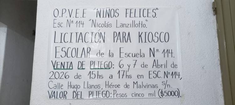 La Escuela N° 114 Nicolás Lanzillotto, junto a la O.P.V.E.E. “Niños Felices”, lanzó una convocatoria a licitación para la concesión del kiosco escolar.
